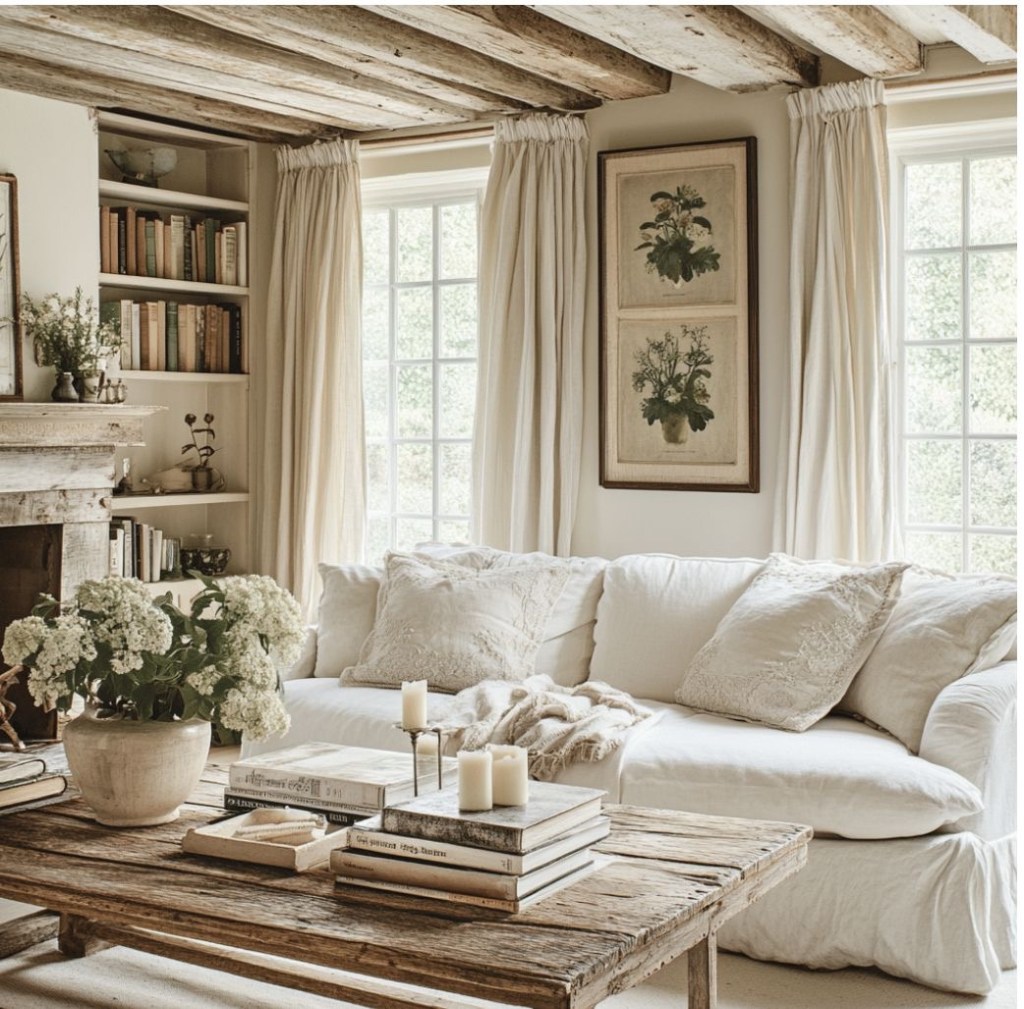 - Textiel, zoals gordijnen, plaids, kussens en kleden, speelt een belangrijke rol in de sfeer van ieder landelijk interieur. Het zijn de zachte, natuurlijke materialen die een huis meteen meer warmte en karakter geven. Gordijnen van linnen of katoen verzachten het daglicht en geven je ramen een rustige en natuurlijke uitstraling. In de woonkamer en slaapkamers zorgen plaids en kussens van wol, linnen of katoen voor dat extra gevoel van comfort. Ze brengen die typische, doorleefde eigen sfeer in huis waar ik zo van houd in landelijke interieurs. Ook vloerkleden van natuurlijke vezels, zoals jute of wol, mogen eigenlijk niet ontbreken. Ze voelen warm aan onder je voeten, dragen bij aan een fijne akoestiek en geven een geborgen sfeer in huis.